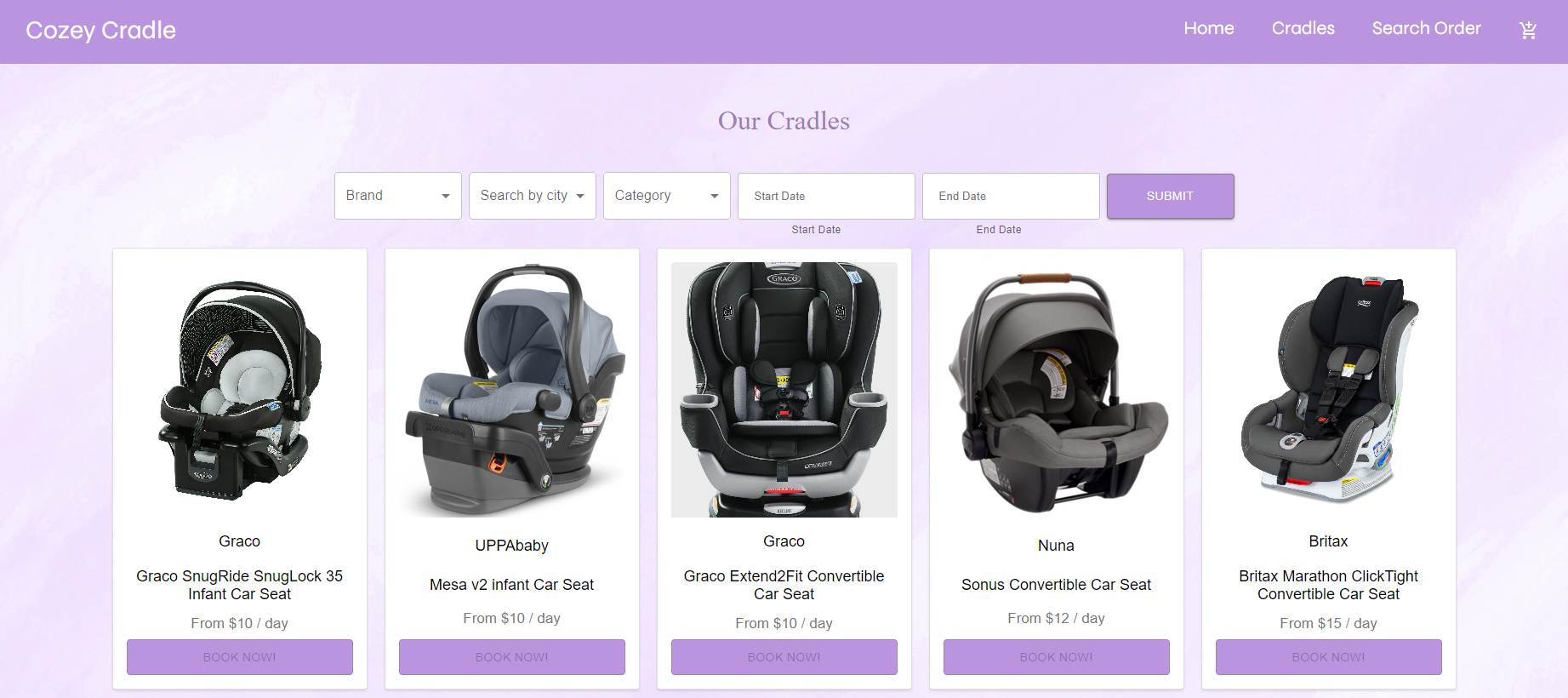 Cozy Cradle is a baby car seat rental service that allows users to rent car seats for their infants. This web application is built using the MERN stack (MongoDB, Express, React, Node.js). Users can browse and filter through a variety of car seats, select the desired rental date and city, add items to the cart, and complete the checkout process using Stripe for payment. Each order is assigned a unique 5-digit confirmation code for easy reference